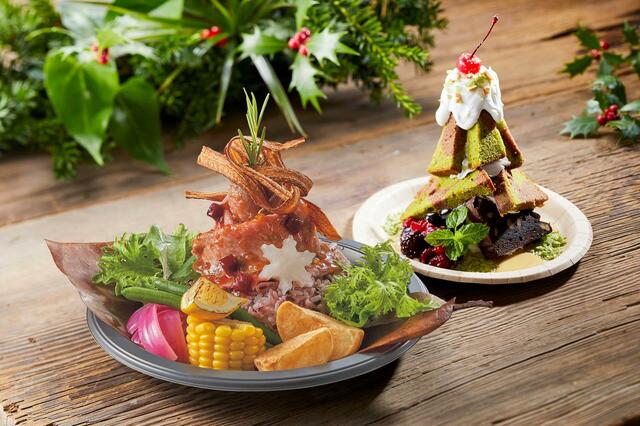 提供メニューは「ジャングル・クリスマス・ツリーセット ~ローストビーフ&古代米入りライス~」や「ジャングル・クリスマスツリー・ケーキ ~ミックスベリー&バニラクリームソース~ 」。