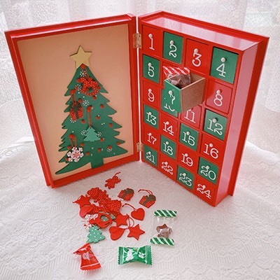木製のブック型アドベントカレンダー。日付けのついた24個の引き出しの中に、お菓子とオーナメントが入っています。