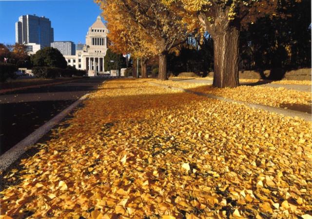 議事堂へ導く黄色の絨毯が美しい国会議事堂も紅葉スポット。国会議事堂の正面、8車線の道路の両側に立ち並ぶイチョウ並木は線対称に配置され、威厳に満ちた趣があります。議事堂に隣接する前庭の南庭は回遊式の庭園で、四季を彩るさまざまな木々が赤や黄に色づきます。