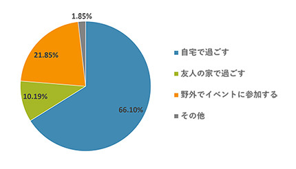 今年(2021年)のハロウィンを、どこで過ごそうと思っているかを尋ねたところ、「自宅で過ごす」が66.10%、「友人の家で過ごす」が10.19%、「野外イベントに参加する」が21.85%、「その他」が1.85%だった。