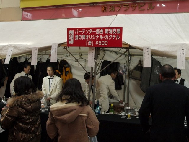 ライブは大盛況に終わり、CD予約のお客さんは握手会へ…というところで、「食の陣の取材もしなければ!」という使命感が頭をもたげ…っていうか鈴木の胃袋はまだまだこれからだ!古町会場を練り歩きます!バーテンダー協会さんが素敵なブースを出してますが、鈴木は下戸なんでアルコールはパスしてごはんどころへ一目散!まずはお刺身のブリ丼&くじら汁。ブリが美味しいのは言わずもがなですが、くじら汁も新潟の郷土料理なんですねー。というかブリカツくんの影響か、なんだかブリをよく食べた一日でした。