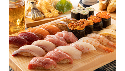寿司と天ぷらほか全81種類の「スタンダード食べ放題プラン」、寿司と天ぷらほか全103種類の「プレミアム食べ放題プラン」の2種類を用意。料金は「スタンダード食べ放題プラン」が男性3839円、女性が3289円、小学生までが1914円。「プレミアム食べ放題プラン」が男性4939円、女性4389円、小学生までが2464円。それぞれ4歳以下は無料。