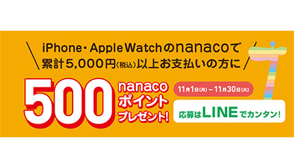 期間中、電子マネーnanaco LINE公式アカウントと友だちになった上でiPhone・Apple Watchのnanaco番号でキャンペーンにエントリーし、期間累計5000円以上支払うと、もれなく500nanacoポイントプレゼントする。すでにnanaco LINE公式アカウントと友だちの場合もエントリーは必要。