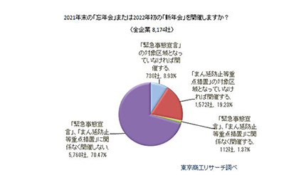 今シーズンは、緊急事態宣言やまん延防止等重点措置の対象区域になっていなければ開催するという回答と、これらに関係なく開催するという回答の合計が約3割ある。しかし店舗により人数や時間制限などもあることから、今年も宴会需要が収縮するとみられ、飲食業や関連業者のダメージが続くことが予想される結果となった。