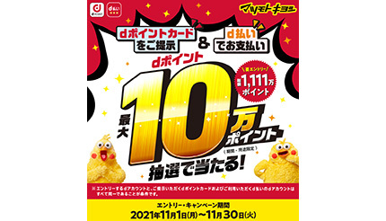 NTTドコモは、スマートフォン決済サービス「d払い」のキャンペーンとして「マツモトキヨシ 抽選で最大10万ポイントが当たるキャンペーン」を11月1日から11月30日23時59分に実施する。