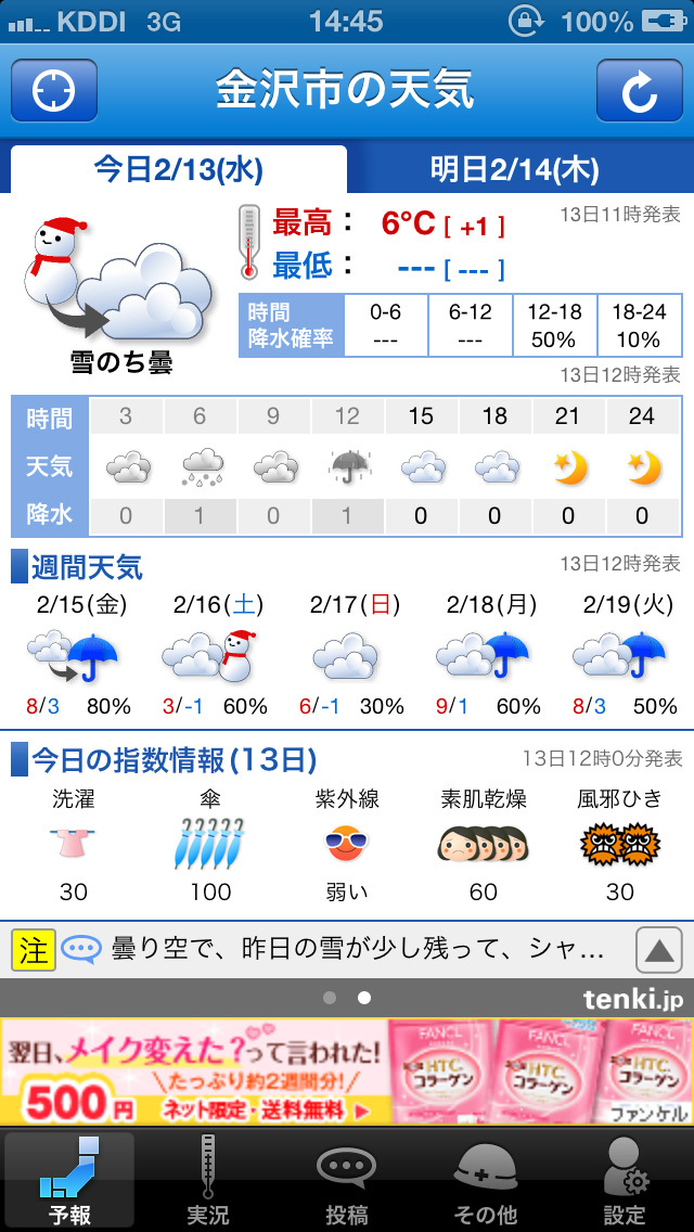 そこでオススメするのが無料の「tenki.jp」。詳細な気象情報を得られる上に、降水確率をバッジで表示してくれる機能のおかげで、アプリを起動させなくても雨が降るかどうかをすばやく確認できるのだ。ユーザーが投稿するヒトコト投稿も楽しい。