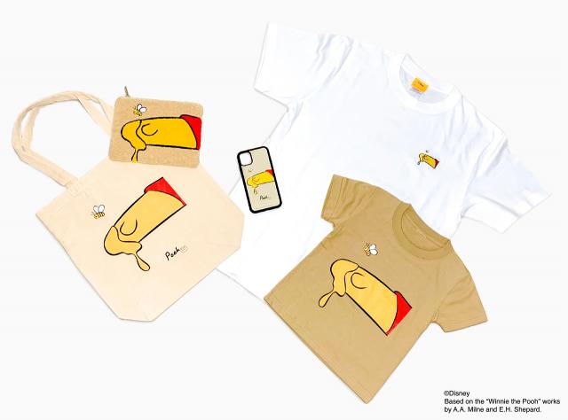 はちみつを手にしたプーさんの手がデザインされたTシャツ(アダルト・キッズ)・トートバッグ・サガラポーチ・iPhoneケース・スマホリングの5アイテムです。