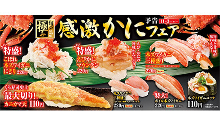くら寿司では11月3日から「旬の極み 感激かにフェア」を開催する。本ズワイガニをぜいたくに使ったにぎりや三種盛りなどが220円で楽しめる。