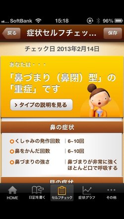 辛い花粉症の症状でお悩みの方にオススメしたいのがこのアプリです。このアプリの主な機能は、「花粉症日記」と「セルフチェック」。花粉症日記のほうは、毎日の花粉症の症状や花粉飛散量を記録していくことができます。