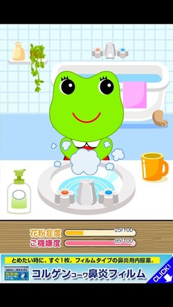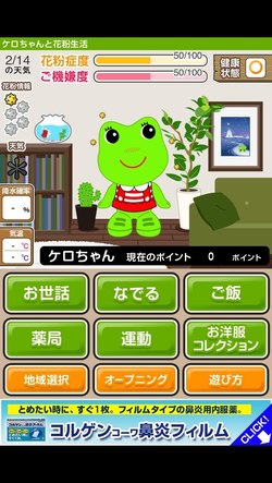 ユーザーは、ケロちゃんが花粉症にならないようにいろいろお世話をしていきます。食事面はもちろん、うがい手洗い、適度な運動、加湿器の設置や掃除、花粉症になってしまったらお薬を飲ませたりと、甲斐甲斐しくお世話をしましょう。