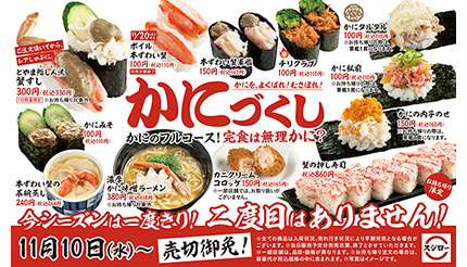 あきんどスシローは11月10日から、今シーズン一度きりの、豊富なバリエーションとさまざまな蟹の味わい方を楽しめるフェア「かにづくし」を、全国の「スシロー」で開催する。