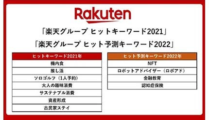 楽天、「楽天グループ ヒットキーワード2021」と「楽天グループ ヒット予測キーワード2022」を発表