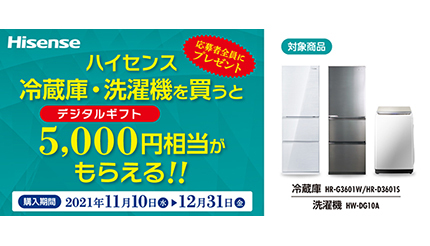 ハイセンスジャパンは11月10日~12月31日の期間中に、対象商品(冷蔵庫、洗濯機)を購入して応募した人全員に対して、5000円相当のデジタルギフト「デジコ」をもれなく還元するキャンペーン「冷蔵庫・洗濯機を買ってデジタルギフト5,000円相当をもらおう!!キャンペーン」を実施する。