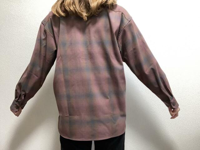 メンズシャツは肩幅が広いので、肩が落ちたような、ゆるっとした感じで着られます。袖も手が1/3ほど隠れる長さになり、かわいらしさが増します。