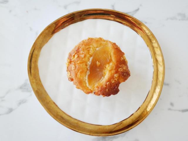 マフィン生地にりんごプレザーブ、クリームチーズを重ね、コーンフレークとキャラメルキャンディチップをトッピングして焼き上げたマフィン。
