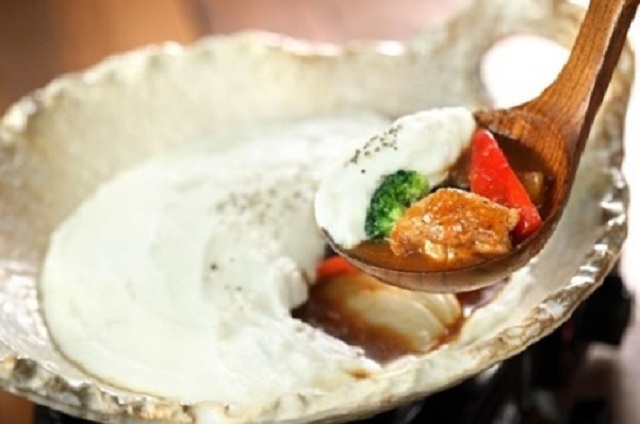見た目のインパクトが半端ない「白いカレー鍋」は、チキンやたまねぎといった一般的なカレーの具材に、茄子やパプリカ、ブロッコリーを加え、土間土間特製のスパイスで味を調えています。特徴的な白い見た目は、生クリームとマッシュポテトの「ふわふわマッシュ」を乗せて仕上げられていて、スパイシーなカレーと混ぜるとマイルドな味わいへの変化が楽しめます。