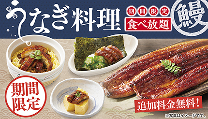 今回のキャンペーンでは、食べ放題牛&豚プレミアムコース、または国産牛スペシャルコースを注文すると、うなぎの逸品料理が追加料金無料で食べ放題になる。使用するうなぎは炭火で焼き上げ、香ばしさが特徴で炭火焼うなぎならではの香りと味を楽しむことができる。食べ放題のうなぎ料理は、「うなぎちらし」、「うなぎ寿司」、「うな玉」、「うざく」、「うなぎおむすび」、「うなとろそば/うどん」となる。