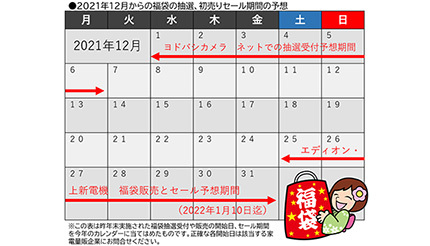 今年の実施予定は各家電量販店とも今のところ未定だが2020年の実績から予想してみよう。ヨドバシカメラは20年12月1日~(数日間)、ネットで福袋の抽選応募を受け付けていた。上新電機は20年12月26日~21年1月11日まで初売りセールで、福袋は発売時期をずらしながら実施した。エディオンも20年12月26日から福袋の店頭販売を開始、21年1月11日まで福袋セールを実施した。