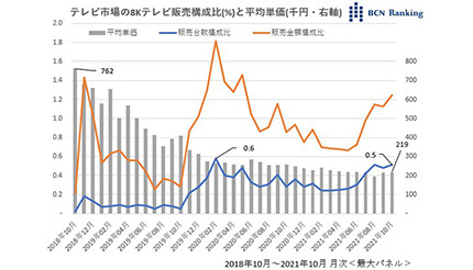 現在日本で8Kテレビを販売しているのはシャープ、LG、ソニーの3社のみ。これまで発売されたラインアップ数も累計で24モデルと少ない。テレビ全体に占める8Kテレビの販売構成比は、この10月時点の販売台数でわずか0.5%、販売金額でも1.2%にすぎない。ただ、19年までは0.1%、販売金額構成比でも1%未満の水準だったことを考えると、存在感は徐々に増してきいることがわかる。足元では伸び悩んでいたが、6月発売のモデルが貢献し10月の時点で、これまでのピークだった20年2月の販売台数構成比0.6%に迫っている。