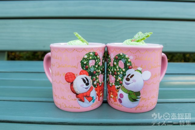 スーベニアカップを2つ並べると、スノーミッキーとスノーミニーが寄り添うデザインになっています。