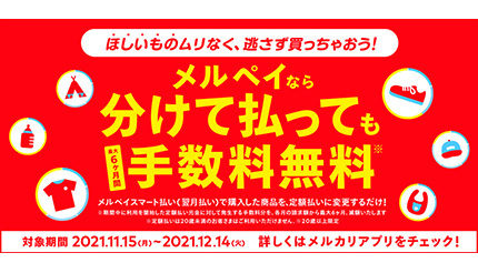 メルペイは、フリマアプリ「メルカリ」のスマホ決済サービス「メルペイ」で11月15日から、新型コロナウイルス感染症の収束を見据えた消費活性化施策として、一部加盟店と共同で後払い決済サービスを活用したキャンペーン「メルペイなら分けて払っても手数料無料キャンペーン」を開始した。
