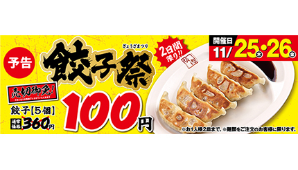 麺食は11月25日・26日に、同社がFC展開する「喜多方ラーメン坂内(ばんない)」において、通常価格360円の餃子を100円で提供する「餃子祭」を実施する。