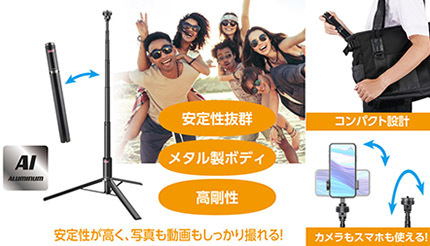 ポール及び脚部はメタル製で剛性が高く、ステーが付くことで強度も増し安定性も抜群。ポール先端を握ってひねるだけでスピーディーに伸縮・固定ができる。ウルトラロックは、関節部の強さと高伸縮が特長のロック方法。縦・横に角度を変えられるスマートフォンホルダーが付属。