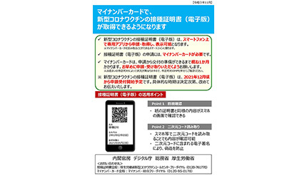 マイナンバーカードは申請から交付までおおむね1カ月かかるため、業務やイベント参加などで「新型コロナワクチン接種証明(電子版)」が今後必要となる場合は、早めにマイナンバーカードの交付申請を行うよう呼びかけている。