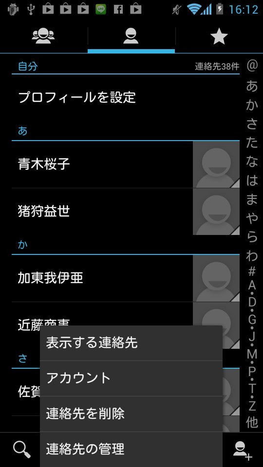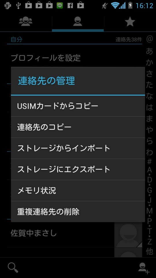 まずは、Androidスマートフォンの電話帳をエクスポートします。エクスポートとは、SDカードへ電話帳のデータをバックアップすることです。Androidスマートフォンの電話帳アプリを起動し、電話帳一覧を表示します。そしてメニューから「連絡先の管理」を選択します。