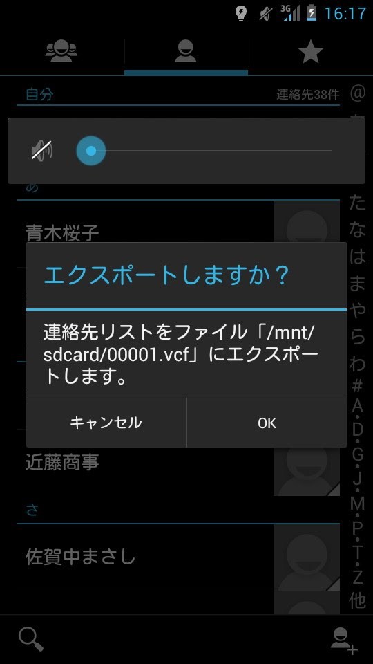 「エクスポートしますか?」と尋ねられたら「OK」をタップします。これで、microSDカード内に「00001.vcf」というファイルが作成されます。過去に同様の操作をしている場合には、ファイル名は異なります。