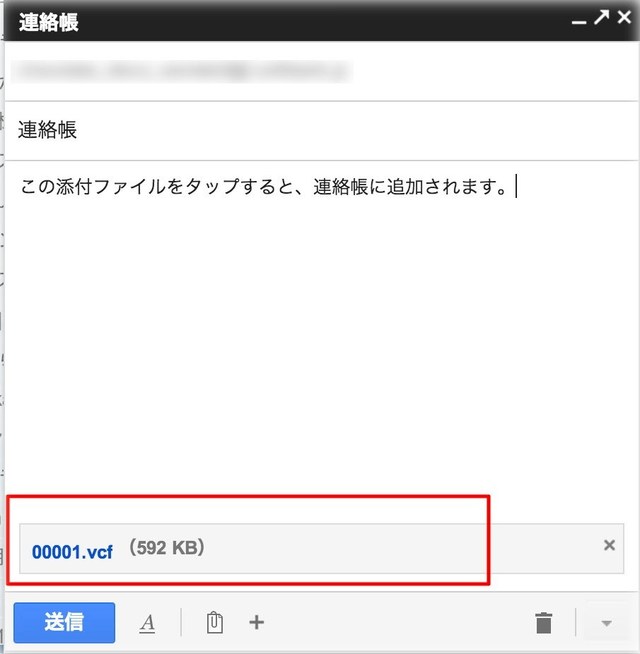 タイトルや本文などは適当でOK。必ず先ほど保存した電話帳ファイルを添付することを忘れないようにしましょう。ファイルが添付されていることを確認したら送信します。