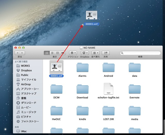 microSDカードがパソコンで認識されたら、開いてみます。そこに先ほどエクスポートした「00001.vcf」というファイルがあるはずです。これをデスクトップにドラッグ&ドロップして保存しておきましょう。