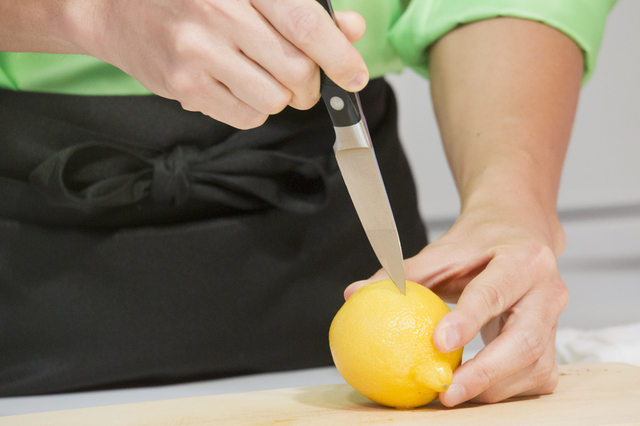【ポイント2】上にかけるレモン。くし形切りでもいいですが、レモンの中央にペティナイフを刺し、レモンの周りをジグザグにナイフを刺すことで、きれいな切り口のレモンが完成!
