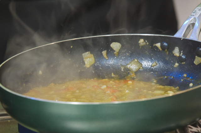 【3】 ミニトマトとコンソメ、カレー粉を加え、トマトを崩しながら炒め、ソース状になったらエビといか、鶏肉を取り出す。