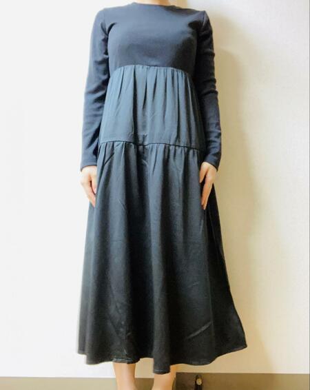 2つの生地が切り替わっているのが特徴的なワンピースで、カジュアルでもあり、きれいめでもある魅力的なアイテムです。