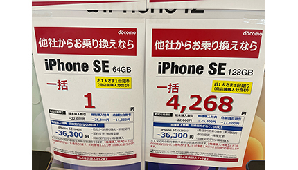 8月半ばから一部の家電量販店で、iPhone SE(第2世代)の64GB各色がMNPなど指定の条件を全て満たすと「一括10円」「一括1円」といった特価で販売され(価格や提供条件は店舗・機種・時期によって異なる)、最近は、iPhone SE(第2世代)の128GBやiPhone 12 miniも同様の特価販売の対象となることもある。こうした戦略的な価格設定が年間販売台数に大きく影響しているようだ。