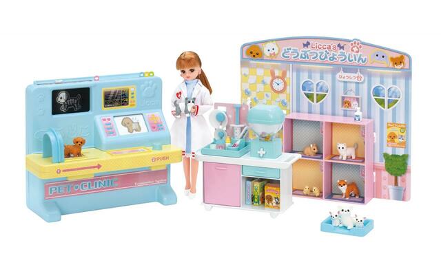 レントゲンや診断ごっこが楽しいリカちゃんの動物病院。ペットが10匹&お薬サーバーや包帯などの小物も付属します。