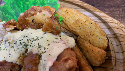 ベルクのタルタルチキンは、ボリュームたっぷりなチキンの上にタルタルソースがふんだんにかけられ、付け合わせのポテトが付いた商品である。価格は1パック430円。