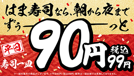 はま寿司は、同社が展開する回転寿司チェーン「はま寿司」において、平日限定で寿司1皿を税別90円(税込99円)で提供するキャンペーンを実施している。