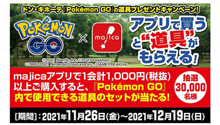 パン・パシフィック・インターナショナルホールディングス(PPIH)グループのオリジナル電子マネー「majica(マジカ)」は、11月26日から12月19日まで、majicaアプリ会員を対象とした「Pokemon GO」のゲーム内の“道具”が当たるキャンペーンを実施する。