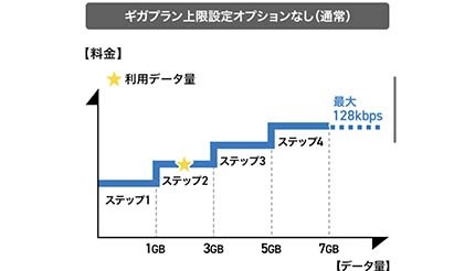 このオプションを従量課金制のギガライト、5Gギガライトの回線に設定すると、設定した容量を超過すると自動で速度制限がかかり、音声通話、キャリア決済(携帯電話料金合算払い)を利用しない場合、利用料金は確実に一定の価格帯に抑えることができる。また、最小容量のステップ1の上限は1GBだが、「ドコモのロング学割」(新規申込終了)適用中は「+2GB特典」適用で上限3GBとなる。同様のオプションは他の大手キャリアにはなく、ドコモ独自の特徴となっている。