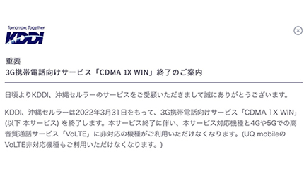 KDDI、沖縄セルラーは、2003年11月に提供を開始したauの3G携帯電話向けサービス「CDMA 1X WIN」を22年3月31日で終了する。すでに18年11月7日に3G向けの各料金プランの新規申込受付を終了。それ以降、当該サービス利用者にはau 4G LTEやau 5Gへの移行(4G LTE/5GのVoLTE対応機種への機種変更)をうながしている。