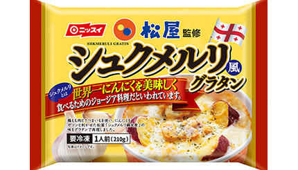今回発売する「シュクメルリ風グラタン」は、ジョージア発、松屋でバズった「シュクメルリ鍋」を、ニッスイの冷凍技術でグラタンとしてアレンジした商品。「復活してほしい」「禁断症状が出てきた」と、多くの消費者からの要望に応え、家庭でも手軽に“松屋のシュクメルリ”が楽しめるよう開発した。