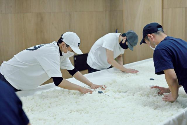 甑を使って蒸し上った米の粗熱を取るため、混ぜながら適温まで冷ましていく 撮影:鈴木規仁