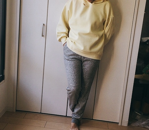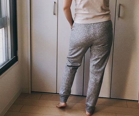 実際に履いてみると、股上がすっきりしているので、たしかに他のスウェットよりはスッキリ着用できそうです。