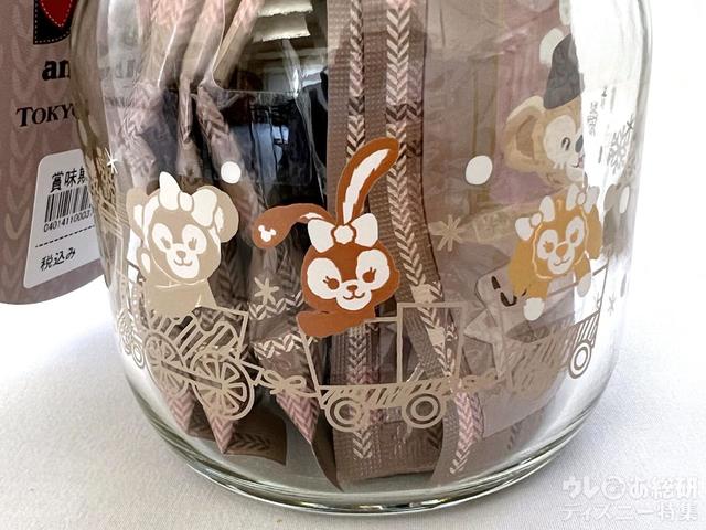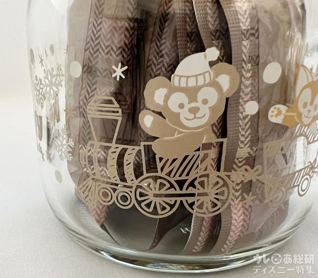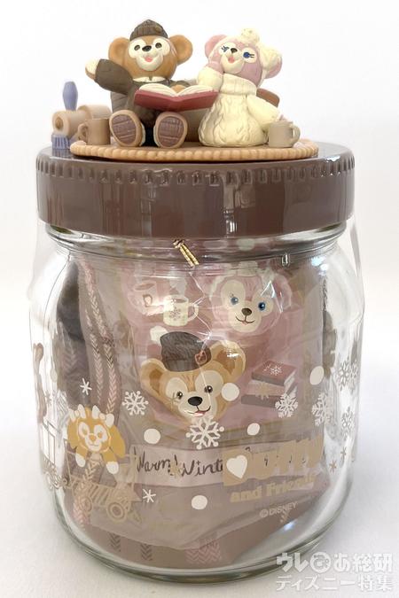 ガラスの瓶の蓋の上にダッフィーとシェリーメイ。