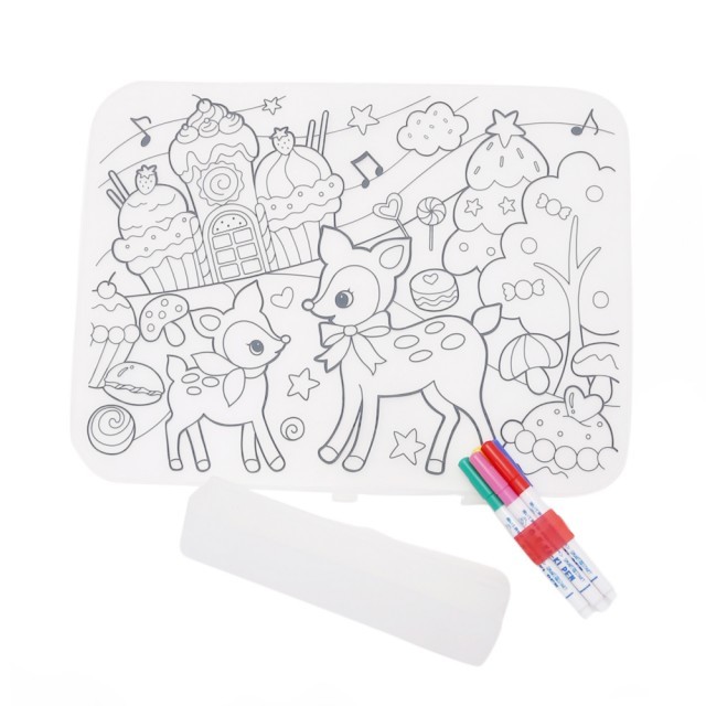 食事の時に2~3歳の子どもがおとなしく座っているのは15分くらいが限度。そこで、食べた後も静かに座っていてほしい外食や旅行の時には、水で消せるペンが付きのぬり絵ができるランチマット「お絵かきダイナ―」が便利。