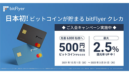なお、「bitFlyer クレカ」の提供を記念し、入会キャンペーンを来年3月31日まで期間限定で実施する。「ビットコインプレゼント」キャンペーンでは、「bitFlyer クレカ」の発行が完了した先着6000人に、500円相当のビットコインをプレゼントする。