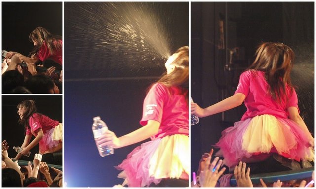 ダブルアンコールでの『祭りの夜』では、ゆうみんがボディボードでしょうか?ともかく板に乗ってフロア上サーフ!この流れ、別現場ではゴムボートで何度か見た気が(笑)。そこでゆうみんが変えてきたのは、なんとボード上で水吹き連発!会場狭しと水を吹きまくるゆうみん、いやー、いつのまにこんな芸達者になったやら…。もはや水芸と言えばHHHかゆうみんか!という勢いでございます。