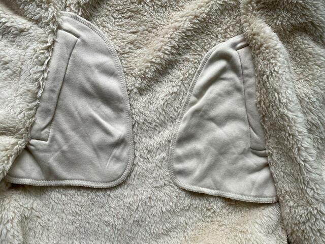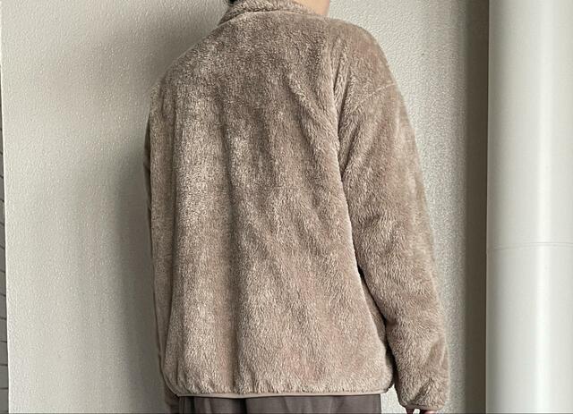 GUの「フリーシーフリースノーカラーコート」は、まるで毛布を着ているかのように表面がふわふわしています。優しい肌触りになっており、とても着心地がいいアウターです。